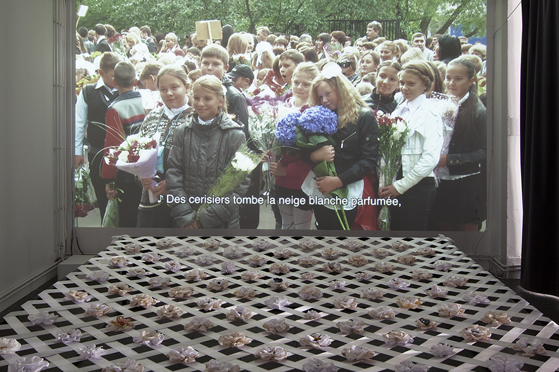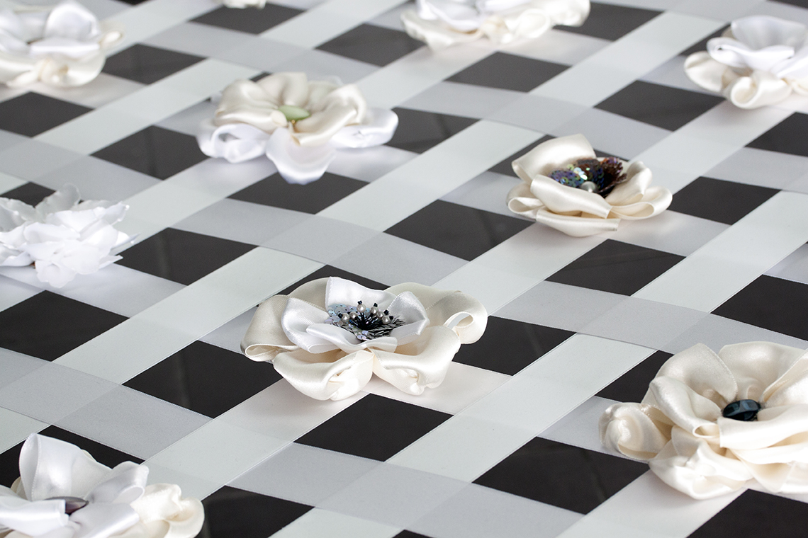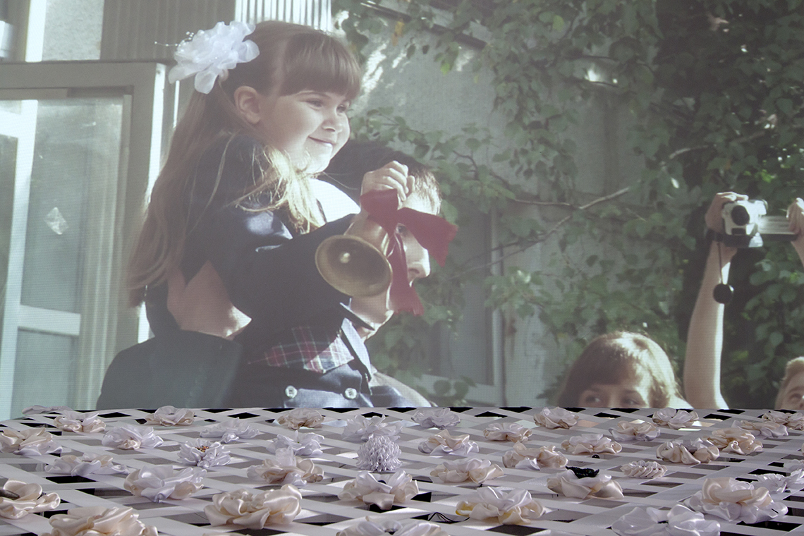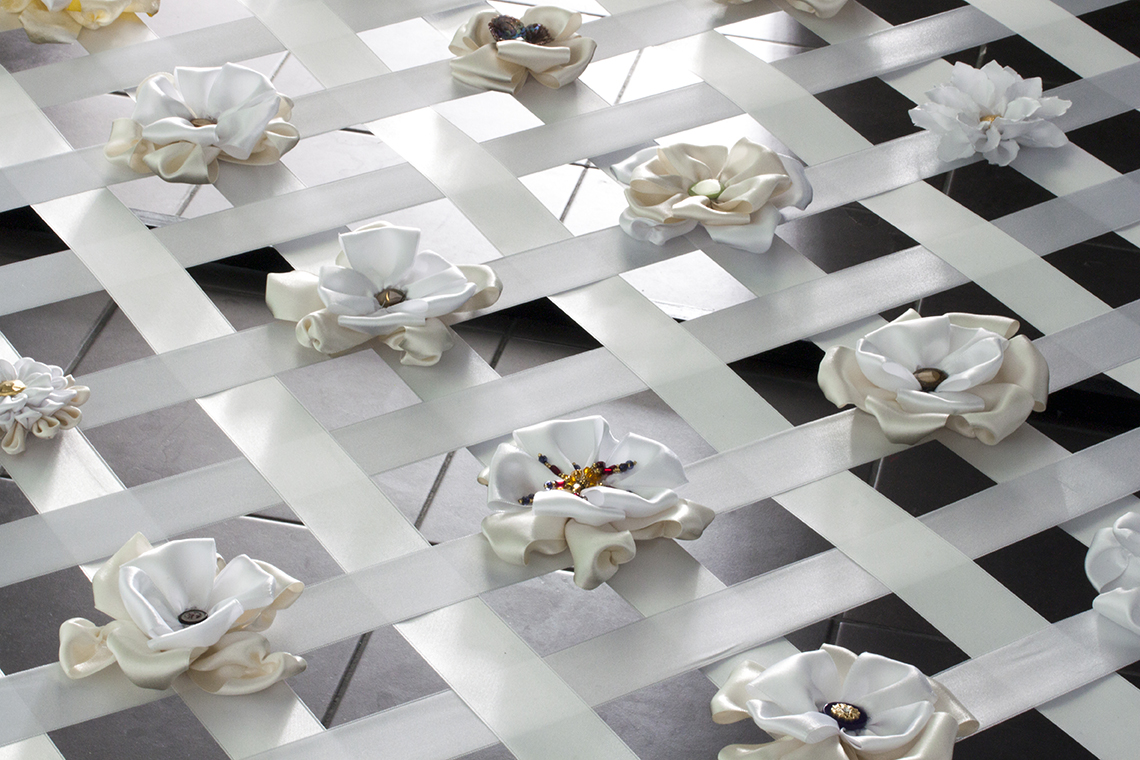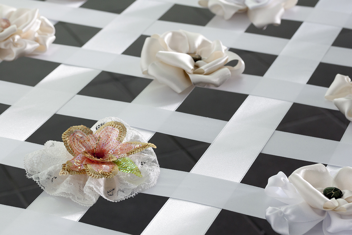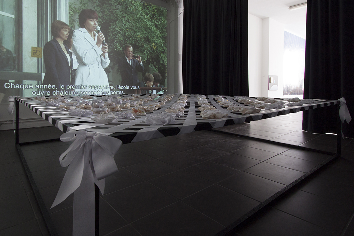Vidéo HD (durée 21’32 »), satin, plastique, bois